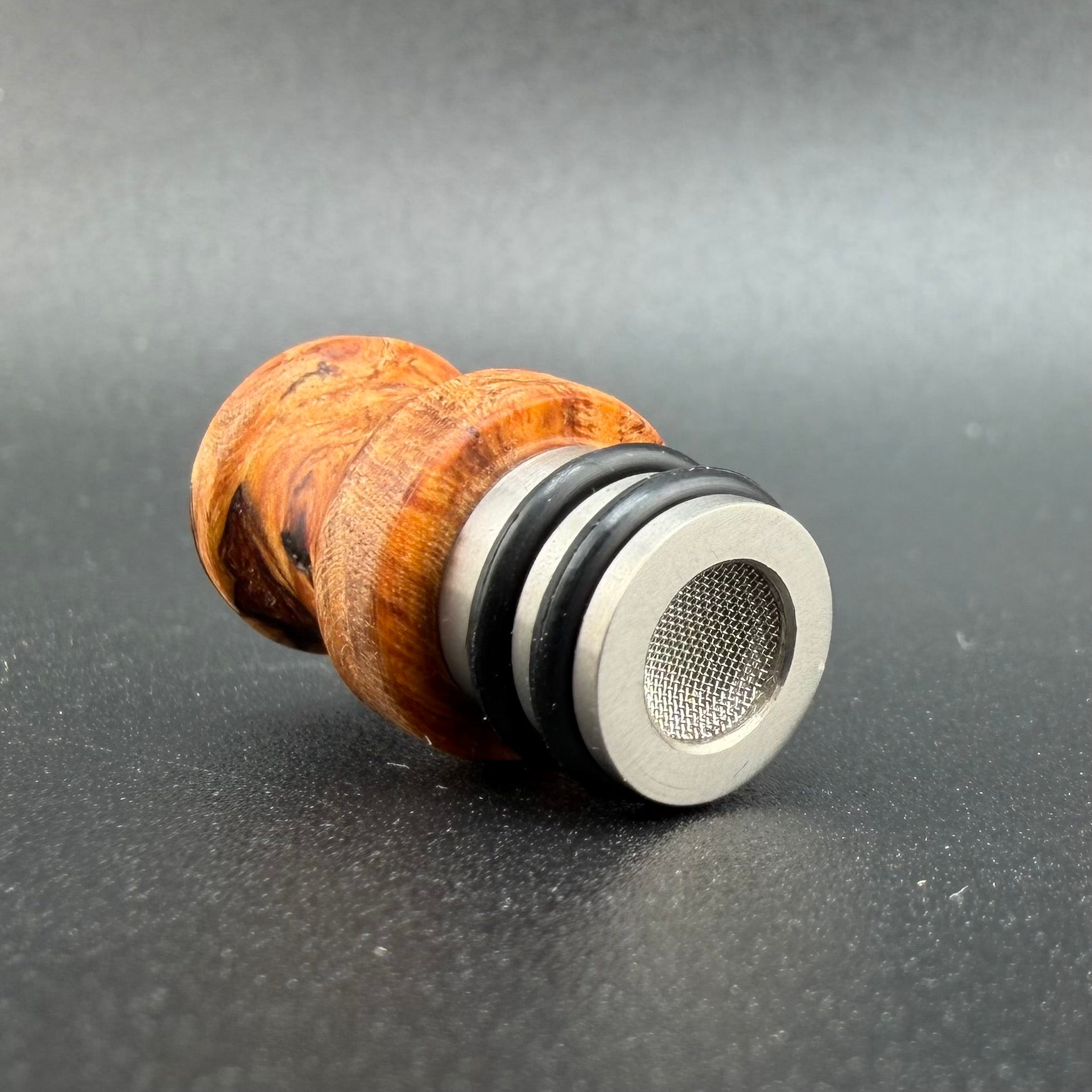 This mouthpiece is hand made by Zasquatch with a hybrid design marrying Titanium with premium woods. The Titanium liner provides a clean air path and increased strength for the wood. A recess on the bottom accepts an included 1/4" pipe screen. When installed on the Toad/Nomad II glass Z-core, the mouthpiece keeps the balls secure. This screen does add a small amount of draw resistance - which I believe improves performance. If you don't use cooling balls, or prefer a loose draw, the screen is easily removed.