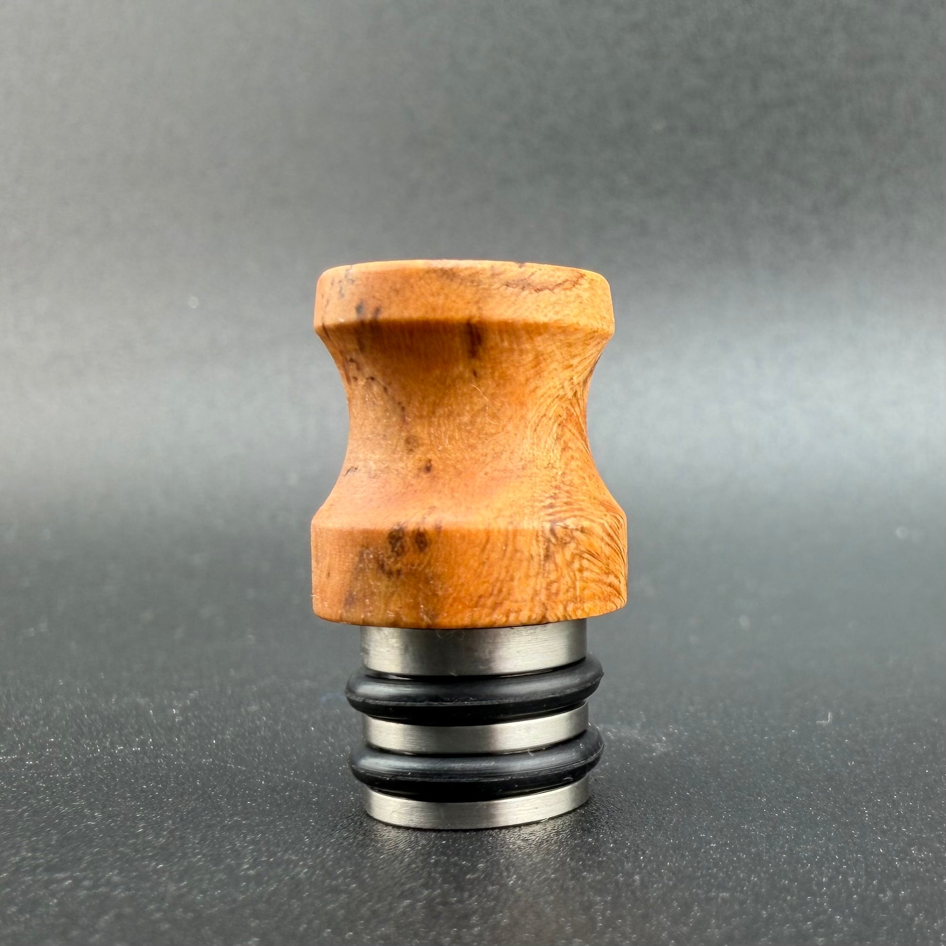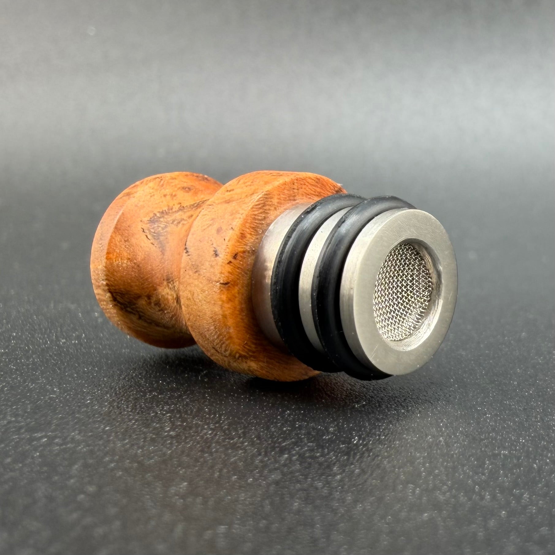 This mouthpiece is hand made by Zasquatch with a hybrid design marrying Titanium with premium woods. The Titanium liner provides a clean air path and increased strength for the wood. A recess on the bottom accepts an included 1/4" pipe screen. When installed on the Toad/Nomad II glass Z-core, the mouthpiece keeps the balls secure. This screen does add a small amount of draw resistance - which I believe improves performance. If you don't use cooling balls, or prefer a loose draw, the screen is easily removed.