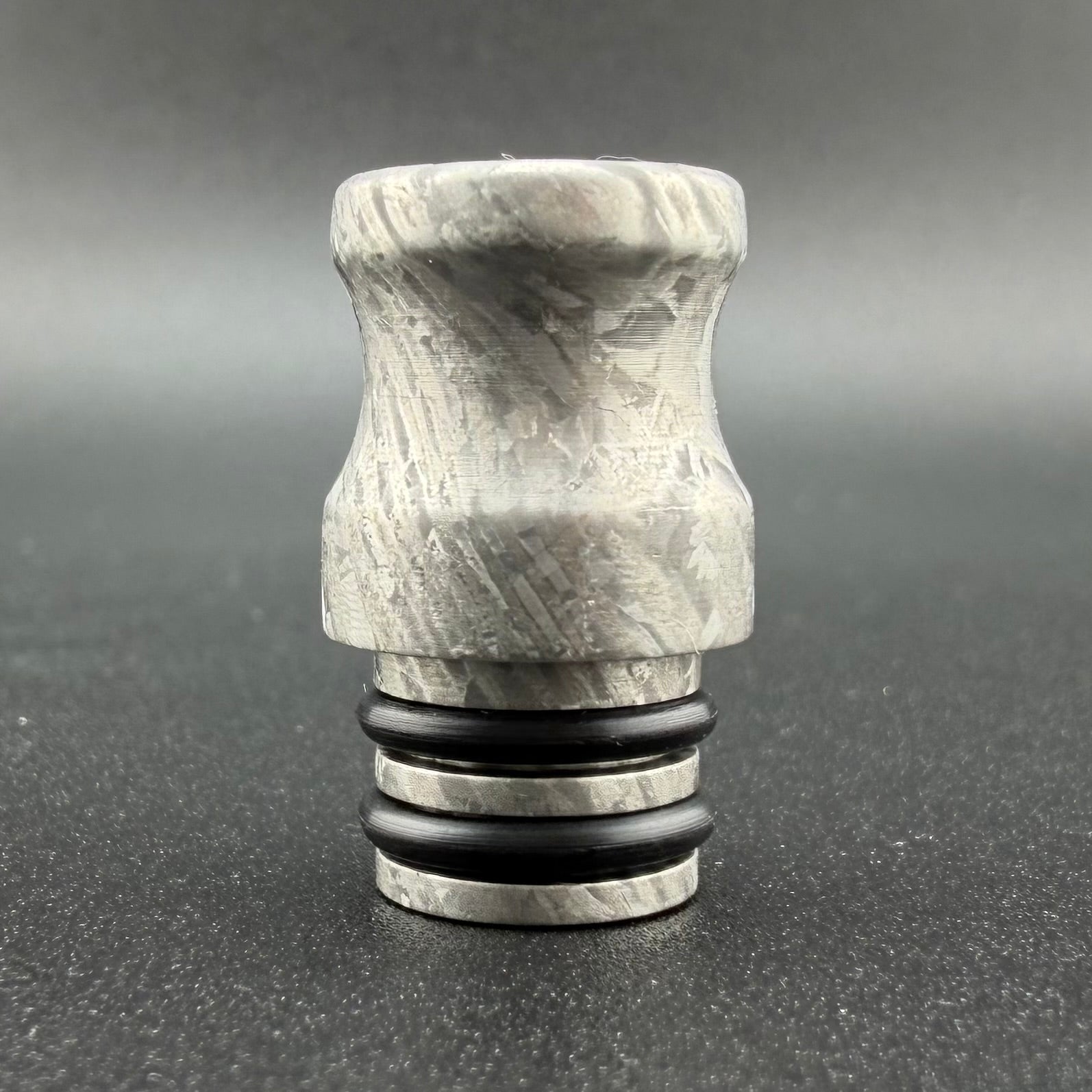 Custom designed mouthpiece for the Z-stem Toad/Nomad II glass Z-core, or other 11mm ID stems. This mouthpiece is hand made by Zasquatch from some insane Crystallized Titanium Damascus. This material is very difficult to photograph - it has small flakes that glisten in the light! When installed on the Toad/Nomad II glass Z-core, the mouthpiece keeps the balls secure.